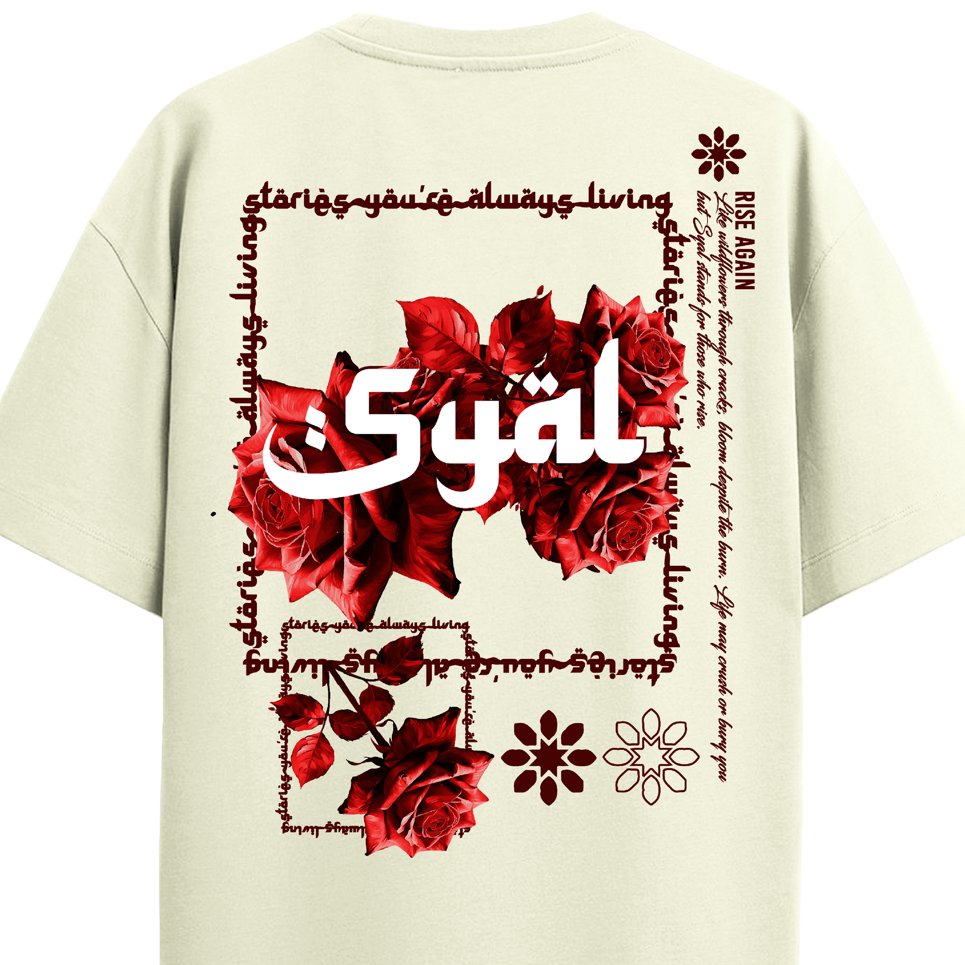 - Design: Bold rose graphic with ancient calligraphic script
