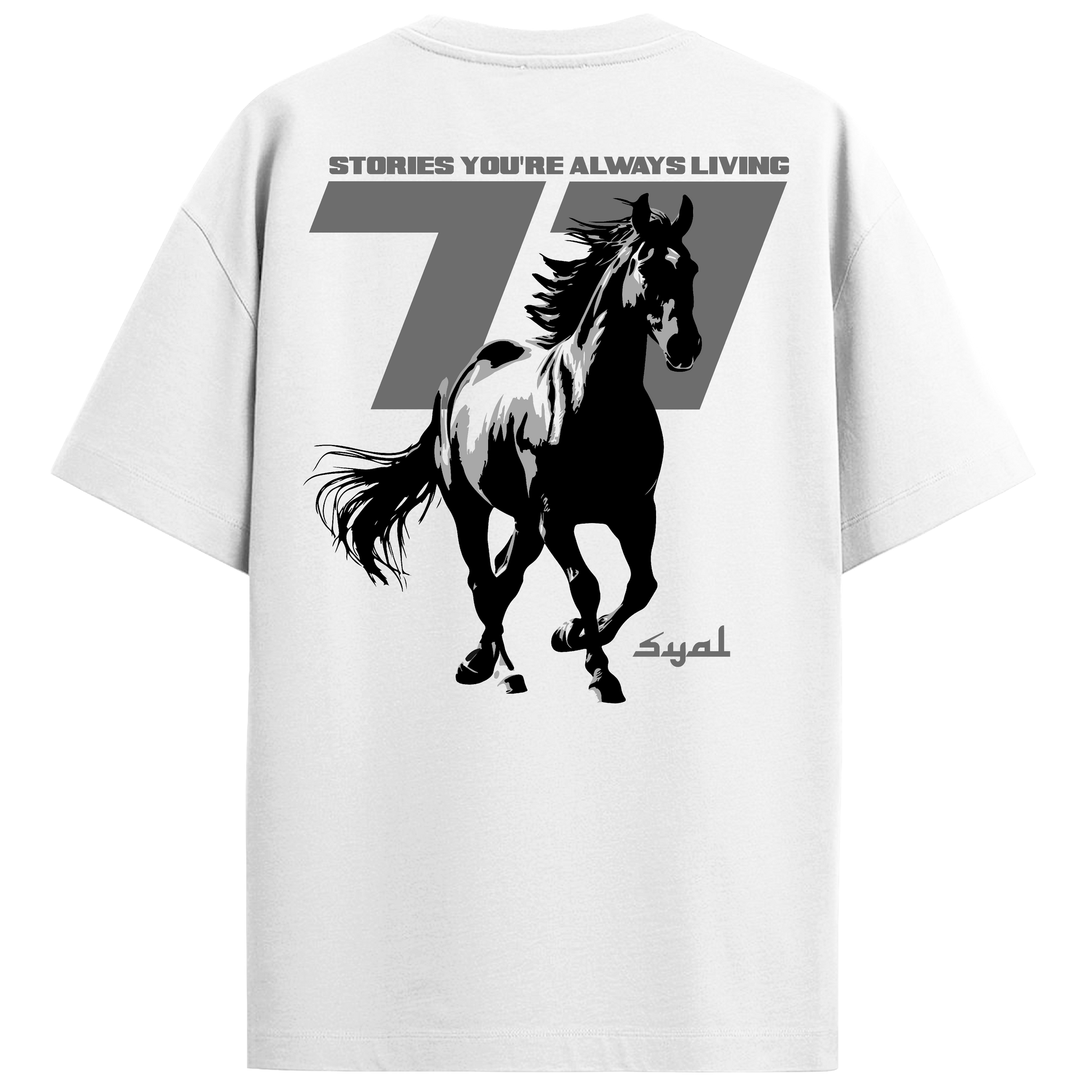 The design channels that same spirit—bold, unrestrained, and tribal—with a stallion mid-gallop against SYĀL’s monolithic typography. The phrase “Stories You’re Always Living” wraps the design in philosophy: you don’t wear a story, you become it.
